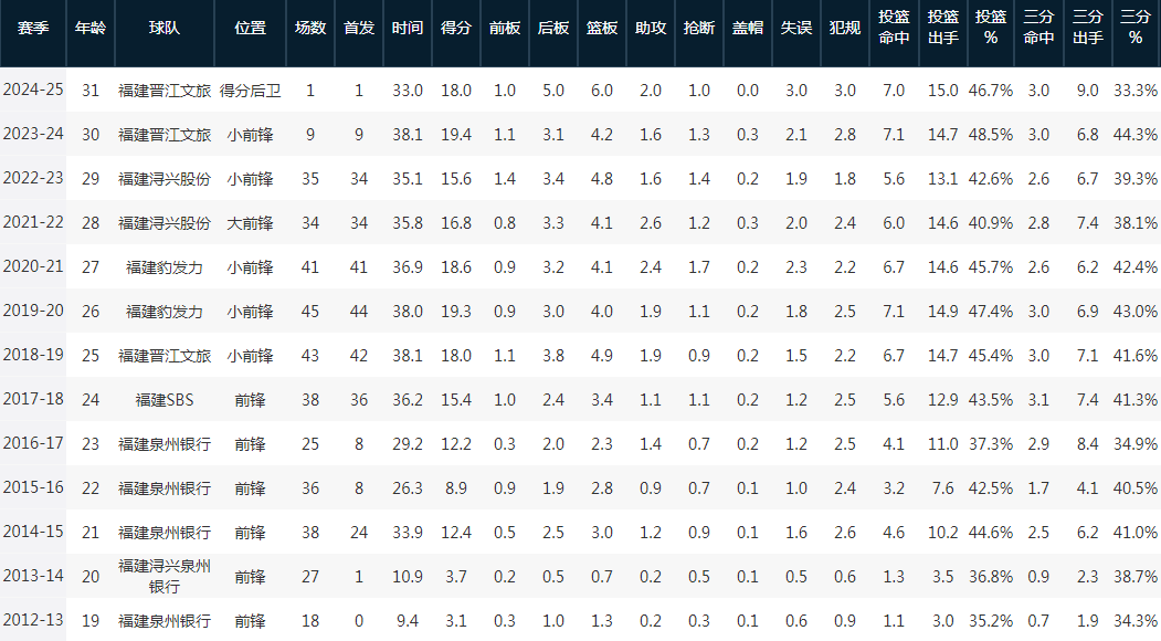 陈林坚曾是CBA数一数二的三分射手,巅峰时期能够连续4个赛季打出三分球命中率40%+的数据。2019-20赛季,他场均可以命中3记三分球,命中率高达43%,是福建男篮最依赖的外线得分点。不过,近两年陈林坚时运不济,先后遭受伤病和车祸困扰,两年只打了10场球,而即便如此,他还是可以场均投进3个三分球,射手本色并未褪色。